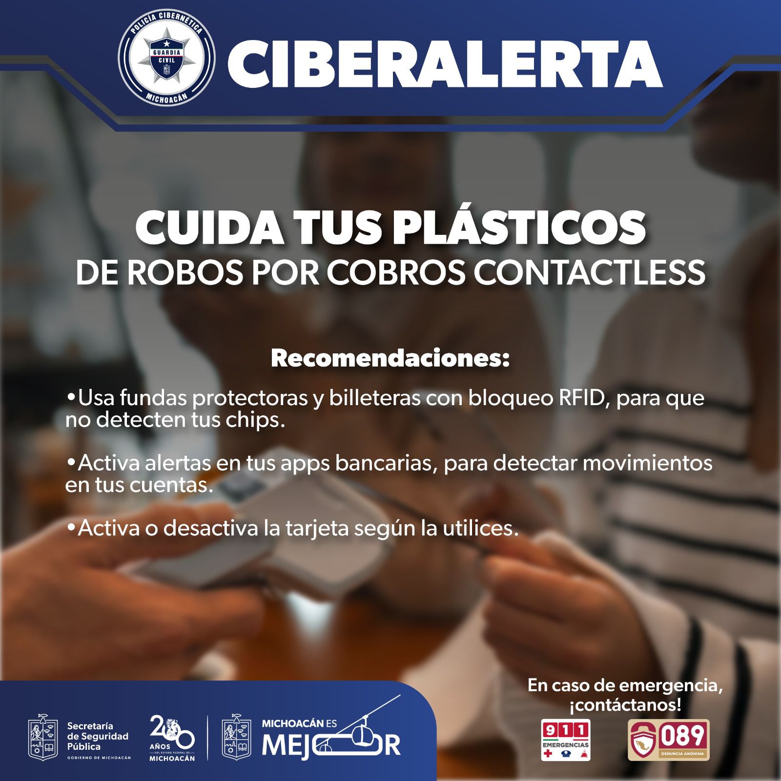Morelia, Michoacán, 22 de Diciembre de 2024.- La Secretaría de Seguridad Pública (SSP) emite una ciberalerta por fraudes en tarjetas con tecnología contactlees, ya que se pueden hacer cobros sin autorización, con solo acercarlas a una terminal.
