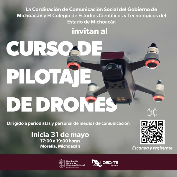 Morelia, Michoacán a 26 de Mayo de 2023.- La Coordinación General de Comunicación Social y el Colegio de Estudios Científicos y Tecnológicos del Estado de Michoacán (Cecytem), ofrecen a periodistas y enlaces de comunicación el curso de Principios de pilotaje de drones, a partir del 31 de mayo.