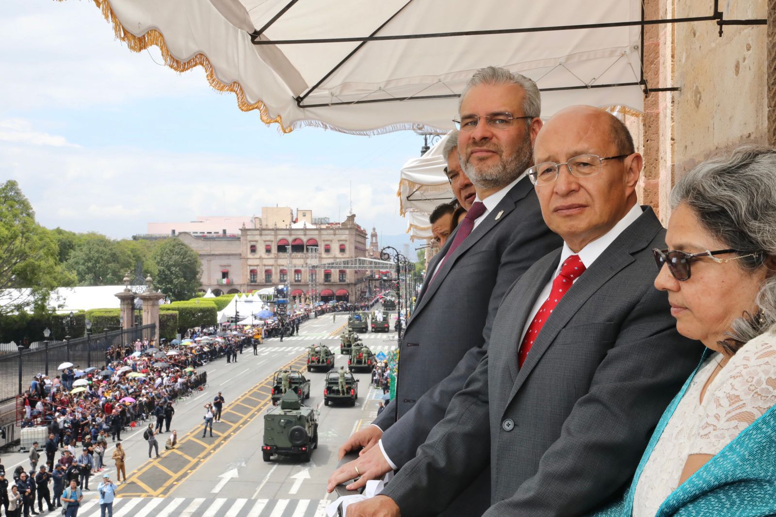 Desde el balcón principal de Palacio de Gobierno, el mandatario estatal Alfredo Ramírez Bedolla presenció el paso de los diversos contingentes integrados por 148 vehículos, 31 motocicletas, 10 bicicletas, 19 caninos, 495 equinos, una lancha, 94 banderas y 368 guiones.