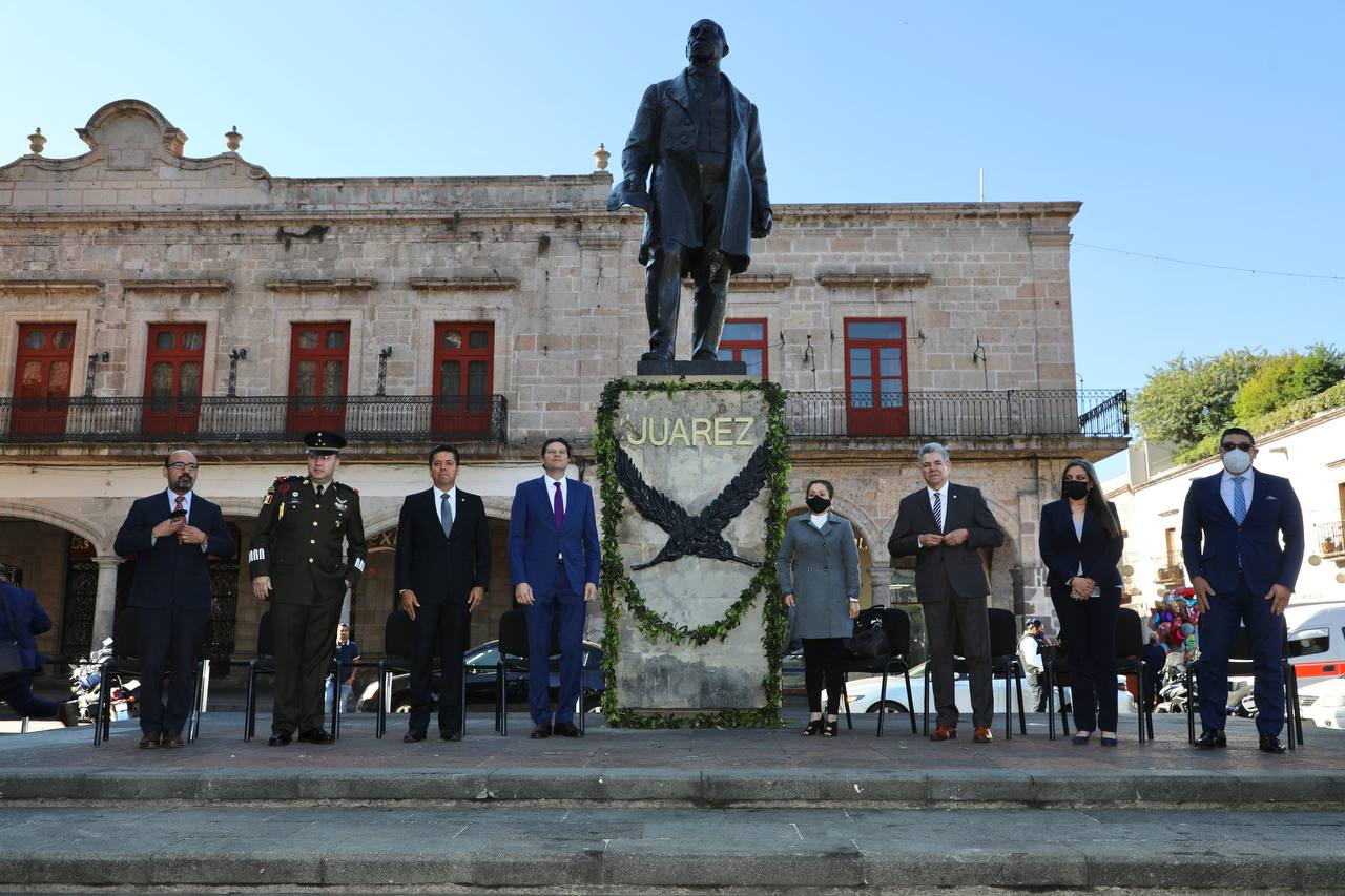 Morelia, Michoacán; a 21 de marzo de 2022.- El presidente de Morelia, Alfonso Martínez Alcázar, en compañía de autoridades municipales y estatales, conmemoró este lunes el CCXVI Aniversario del Natalicio de Benito Juárez, con el izamiento de la Bandera Nacional y ceremonia cívica en su memoria.
