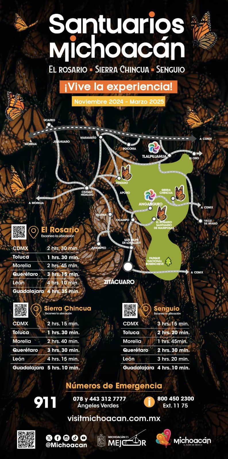 Morelia, Michoacán a 17 de Noviembre de 2024. Ante la apertura de los Santuarios de la Mariposa Monarca de Sierra Chincua, El Rosario y Senguio, la Secretaría de Turismo del estado publicó a través de sus redes sociales una imagen explicativa de la ruta y el tiempo de trayecto para arribar a dichos recintos, a fin de guiar a los miles de turistas y visitantes que arribarán en la presente temporada.