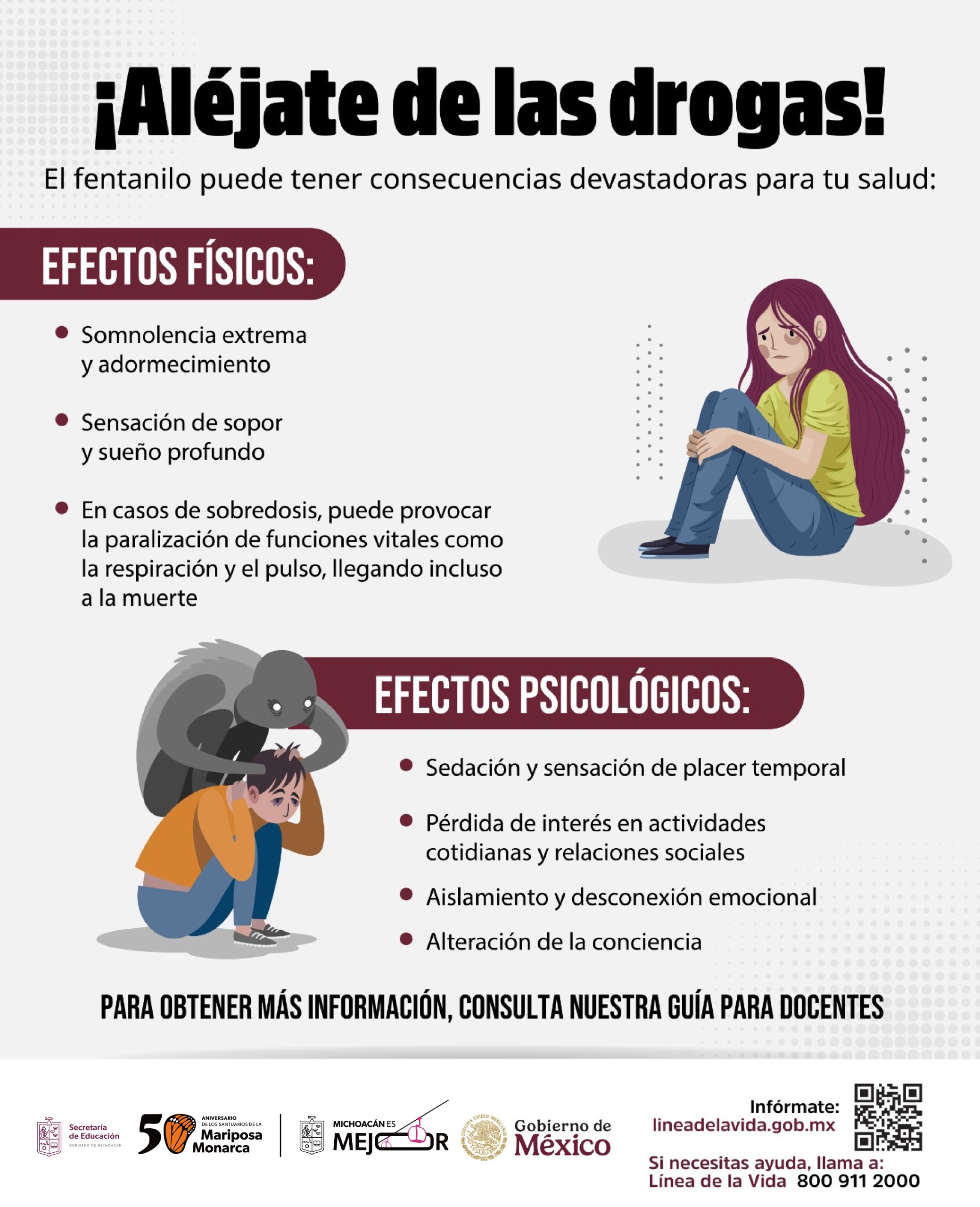 A través de la concientización y el trabajo en equipo con docentes, personal educativo, tutores, madres y padres de familia, se impulsa la campaña «El fentanilo te mata, aléjate de las drogas», dirigida a más de 400 mil estudiantes en Michoacán.