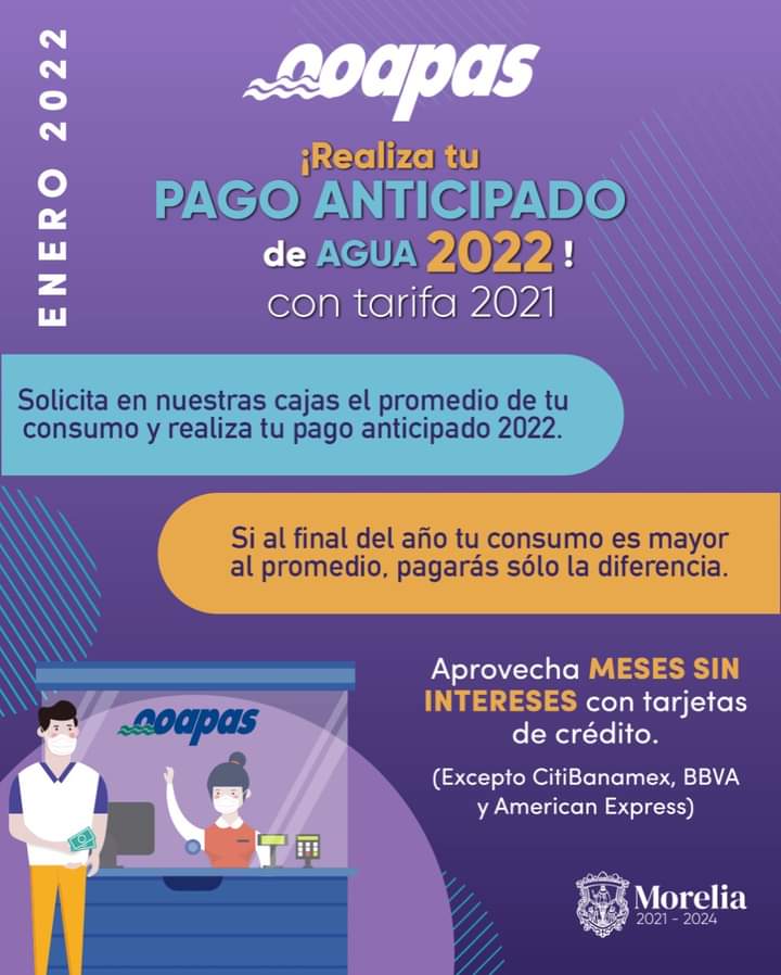 Morelia, Michoacán, a 28 de enero de 2022.- A tres días de concluir el primer mes del año, el Organismo Operador de Agua Potable, Alcantarillado y Saneamiento de Morelia (OOAPAS) informa que continúa su Programa de Pago Anticipado hasta concluir enero, para que los morelianos paguen el agua del 2022 con la tarifa del 2021.