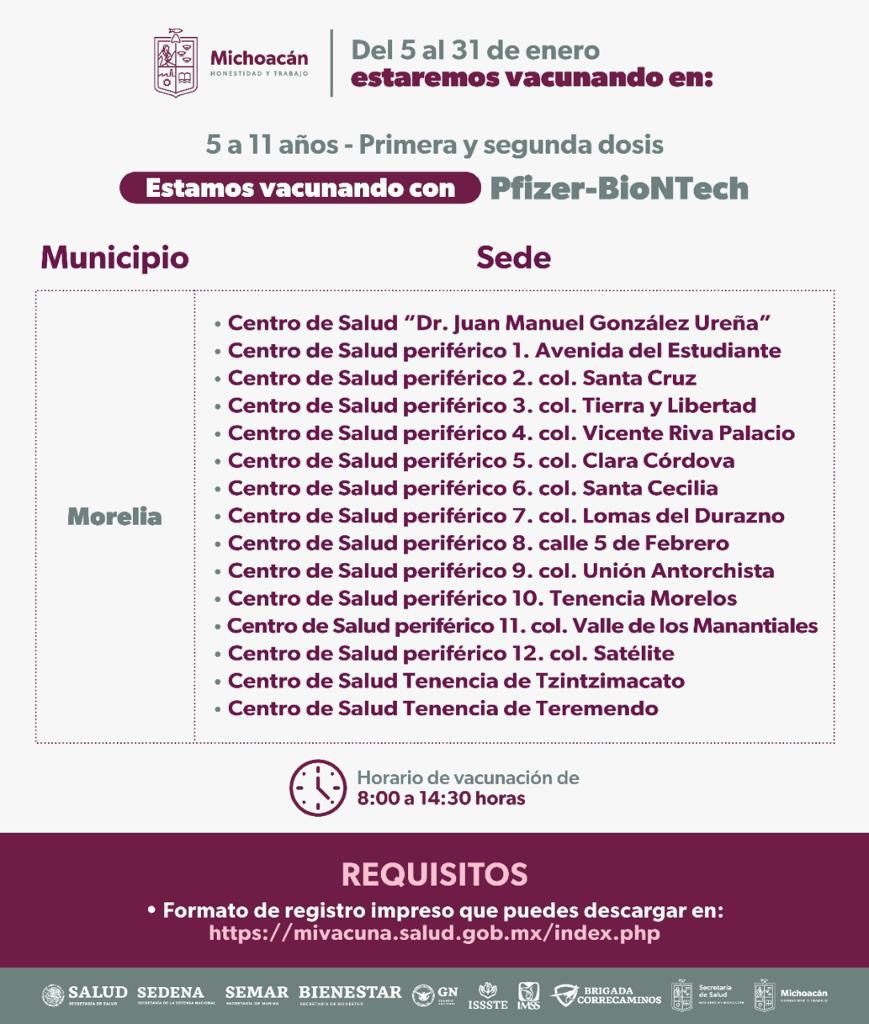 Las sedes ya están anunciadas en la página de la Secretaría de Salud de Michoacán (SSM) y el formato de registro puede hacerse a través del enlace https://mivacuna.salud.gob.mx.
