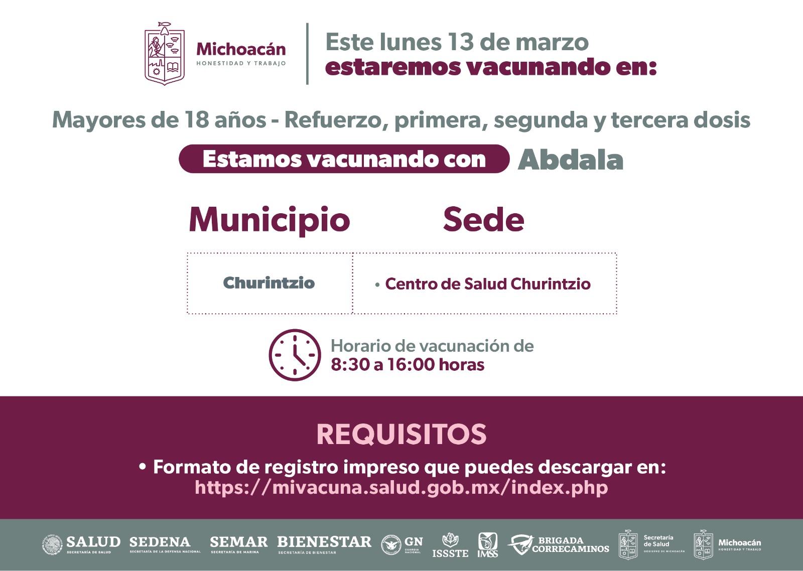 Morelia, Michoacán a 12 de Marzo de 2023.- Refuerzos, y primeras, segundas y terceras dosis de vacuna contra el COVID-19, se aplicarán del 13 al 31 de marzo a la población michoacana mayor de 18 años en 84 municipios del estado.
