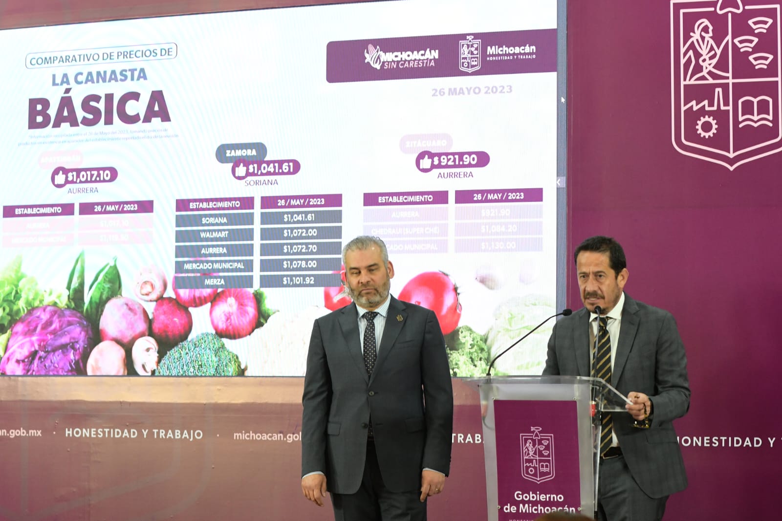 Morelia, Michoacán a 29 de Mayo de 2023.- En la última semana, el costo más alto de los 25 productos de la canasta básica que arrojó el monitoreo de costos en seis municipios michoacanos fue de mil 384 pesos 30 centavos registrado en Lázaro Cárdenas, en tanto que, el más económico, fue de 921 pesos 90 centavos, reportado en Zitácuaro. En rueda de prensa encabezada por el gobernador, Alfredo Ramírez Bedolla, el secretario de Desarrollo Económico, Claudio Méndez Fernández informó que la inflación alimentaria continúa a la baja, ya que en el lapso comprendido de octubre de 2022 a abril de 2023 ha disminuido 4.7 por ciento.El funcionario expuso los resultados del monitoreo, que arrojaron a Zitácuaro, nuevamente, como el municipio donde se ofreció el mejor precio; seguido por Lázaro Cárdenas, con 962 pesos y 90 centavos; en Morelia se registró en 971 pesos; en Uruapan de mil pesos 40 centavos.En Apatzingán, el costo más bajo fue de mil 17 pesos 10 centavos; en tanto que en Zamora fue de mil 41 pesos 61 centavos ofrecido en Soriana. En cuatro de los referidos municipios, fue la cadena Aurrerá la que ofreció los mejores precios.Sobre el comportamiento del precio del kilogramo de huevo, Méndez Fernández refirió que en el municipio de Lázaro Cárdenas se reportó el más bajo, que fue de 47 pesos, pero también el más elevado, en 62 pesos.