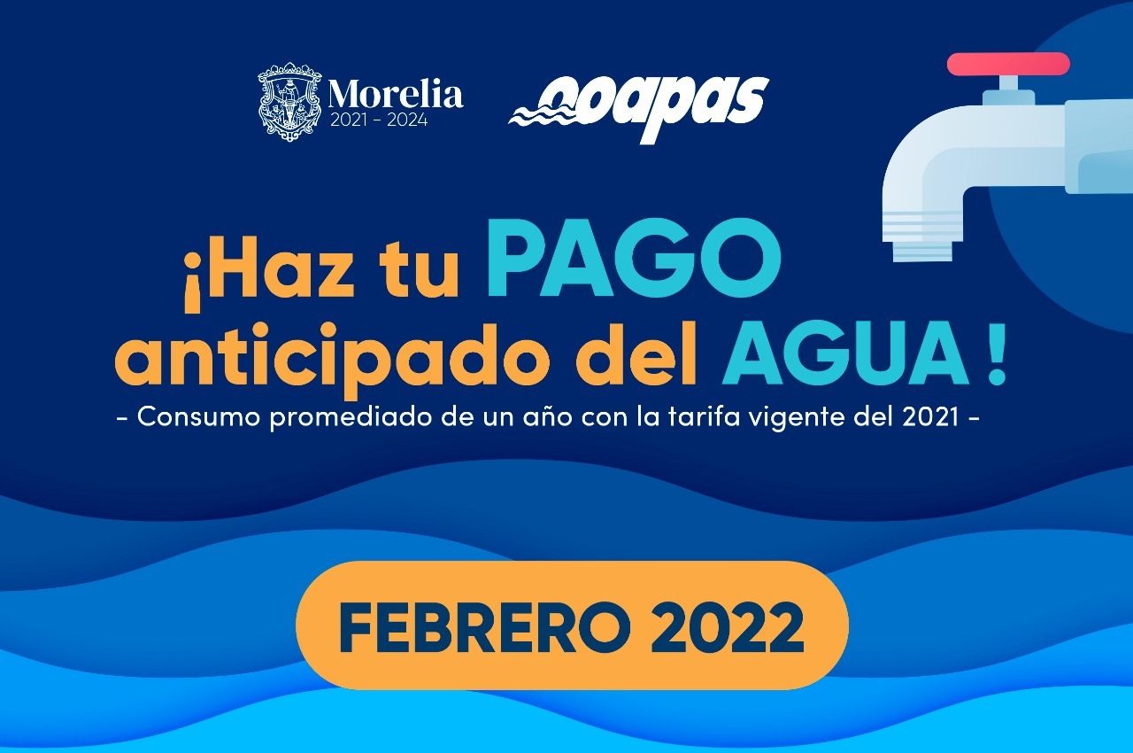Morelia, Michoacán, a 31 de enero de 2022.- El Organismo Operador de Agua Potable, Alcantarillado y Saneamiento de Morelia (OOAPAS) mantendrá su Programa de Pago Anticipado todo el mes de febrero, para que los morelianos paguen el agua del 2022 con la tarifa del 2021.