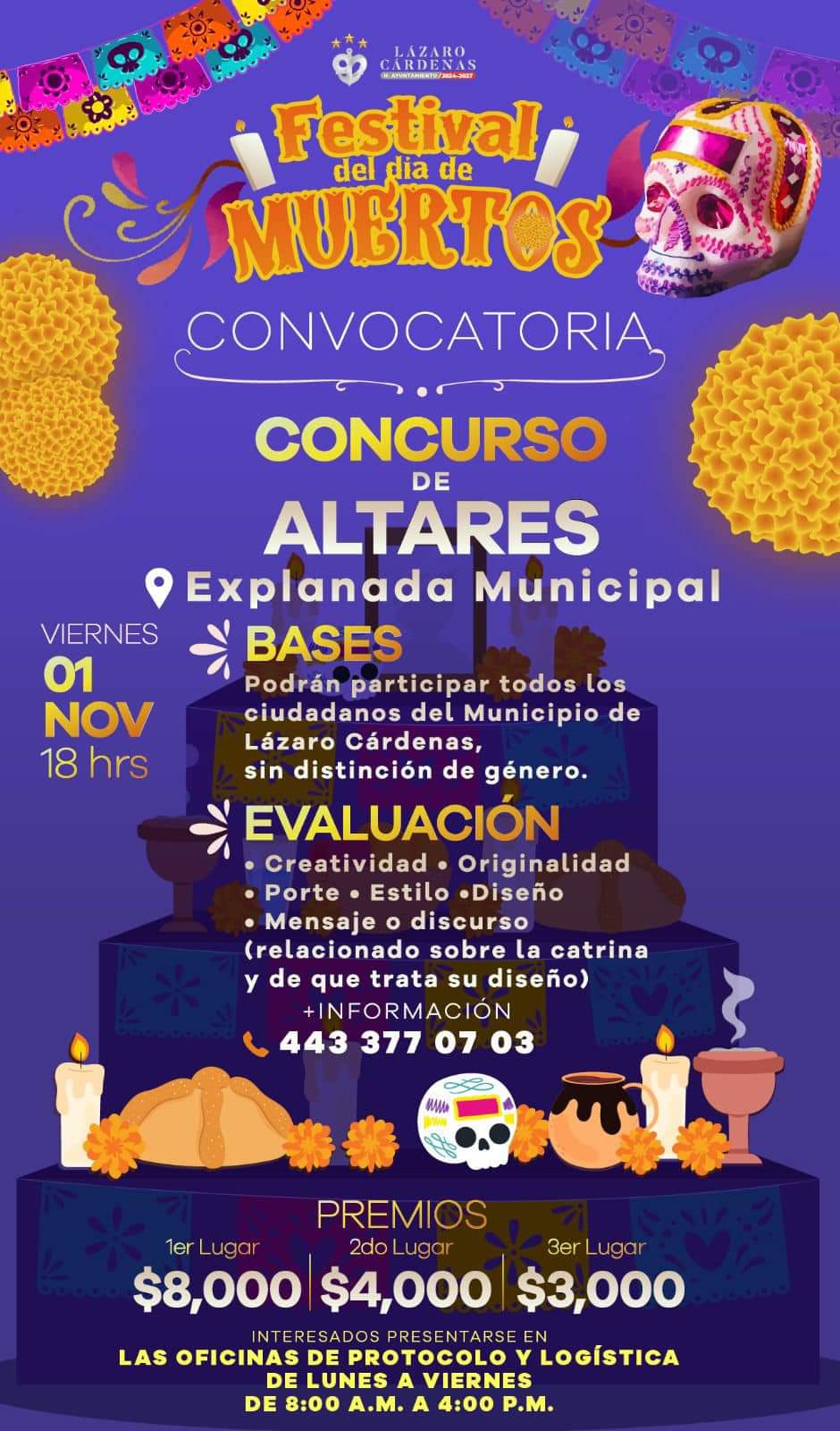 Para más información, los interesados pueden comunicarse al 443-377-07-03 o presentarse en las oficinas de Protocolo y Logística del H. Ayuntamiento, de lunes a viernes, de 08:00 am a 4:00 pm. ¡No te pierdas esta oportunidad de celebrar y honrar nuestras tradiciones!