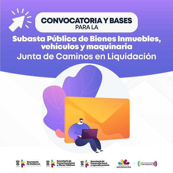 Morelia, Michoacán, 21 de Marzo de 2021.- El Gobierno de Michoacán, a través de la Secretaría de Comunicaciones y Obras Públicas (SCOP), convoca a la subasta para la enajenación de bienes muebles e inmuebles propiedad de la Junta de Caminos, en liquidación, que se desarrollará el próximo jueves 25 de marzo de 2021, a las 12:00 horas, en el salón Michoacán del Centro de Convenciones y Exposiciones (Ceconexpo) de Morelia.