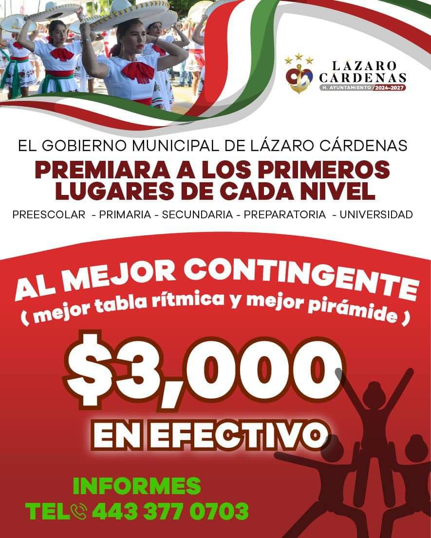 Cd. Lázaro Cárdenas, Michoacàn a 11 de Noviembre del 2024.- El próximo 20 de noviembre se conmemora el 114° Aniversario de la Revolución Mexicana; por lo que el Gobierno Municipal convoca a las escuelas de los diferentes niveles a que participen en el Desfile Cívico-Deportivo; el cual este año se llevará a cabo en horario vespertino, iniciando a las 5 de la tarde desde Jugos Acapulco, y que tendrá un Concurso de Tablas Rítmicas y Pirámides.