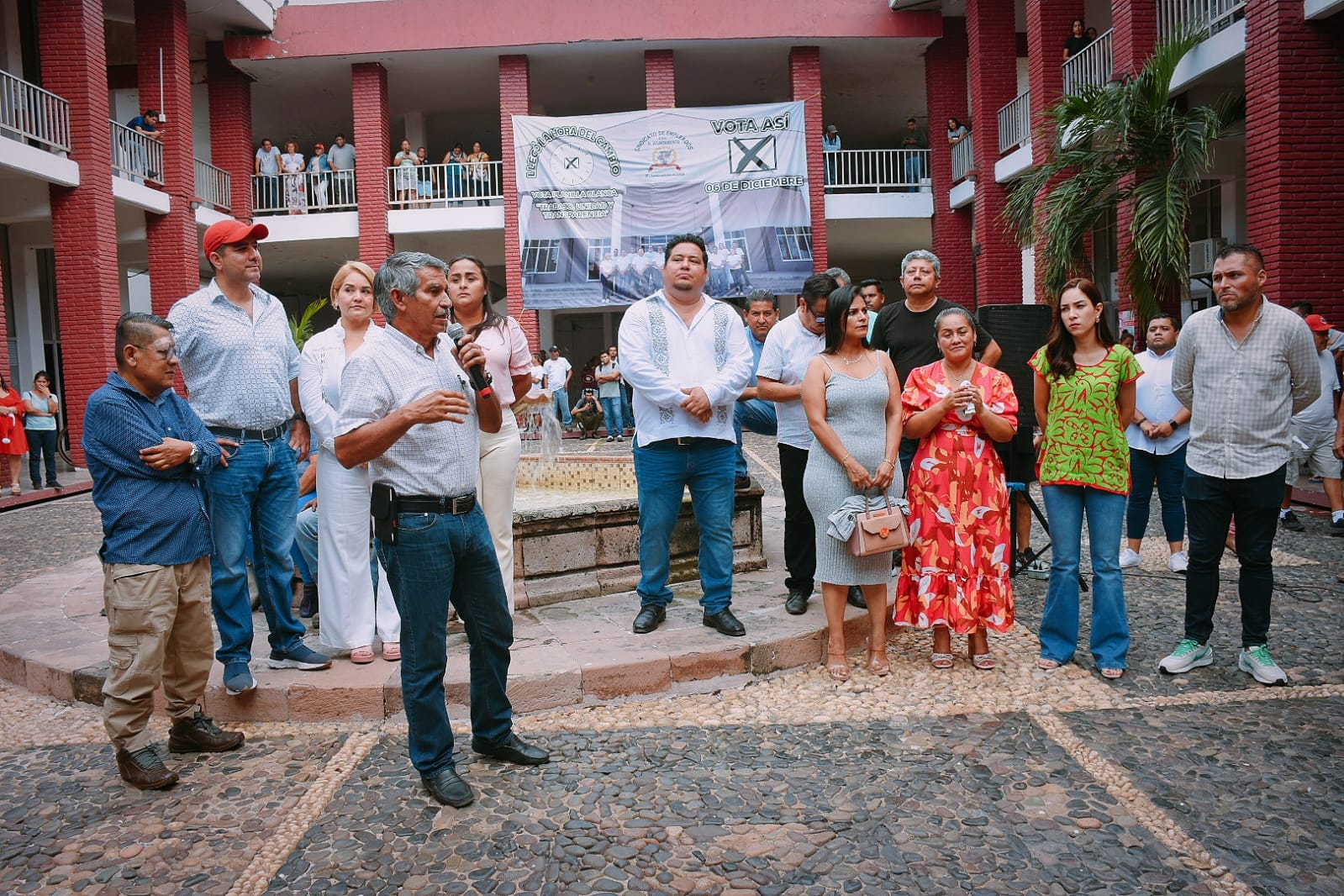 Concentrados en el patio central, José Abarca García, Sindicato de Empleados del Honorable Ayuntamiento de Lázaro Cárdenas, (SEHALC), reconoció al Órgano de Gobierno; al Encargado de Despacho de la Presidencia, Manuel Esquivel; la Tesorera Municipal, Ángeles Berenice Olea Escobar y a la Presidenta Municipal con licencia, Itzé Camacho, ya que durante estos años se ha mantenido un respeto al gremio y se ha cumplido con los compromisos y obligaciones, como este caso el aguinaldo y fondo de ahorro en tiempo y forma.