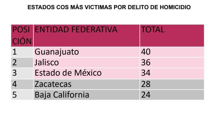 Es importante señalar que los estados que actualmente se ubican en el top cinco por delito de homicidio son: Guanajuato, Jalisco, Estado de México, Zacatecas y Baja California.