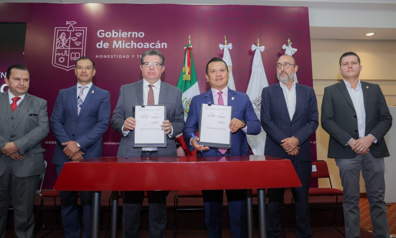 En este acto de firma de convenio estuvo presente también el subsecretario de Enlace Legislativo y Asuntos Registrales, Humberto Urquiza Martínez; el consejero jurídico del Ejecutivo, César Augusto Ocegueda Robledo; el director del Notariado y Archivo General de Notarías, José Antonio Medina García; el secretario del Colegio de Notarios de Michoacán, Marco Vinicio Aguilera Garibay, así como las y los integrantes de este órgano colegiado.