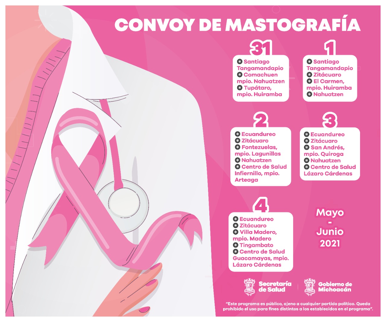 Morelia, Michoacán, a 30 de mayo de 2021.- En aras de seguir realizando detecciones oportunas de cáncer de mama, la Secretaría de Salud de Michoacán (SSM), desplegará sus 5 unidades móviles del 31 de mayo al 4 de junio, en 11 municipios.