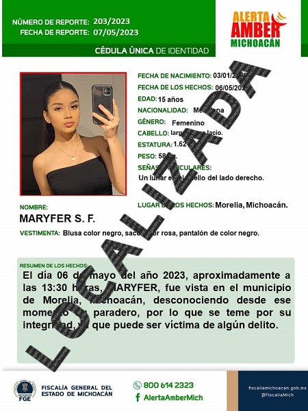 Morelia, Michoacán, a 08 de Mayo de 2023.- La Fiscalía General del Estado de Michoacán (FGE) desactivó Alerta Amber al localizar a una adolescente de 15 años, quien ayer fue reportada como desaparecida en esta capital.