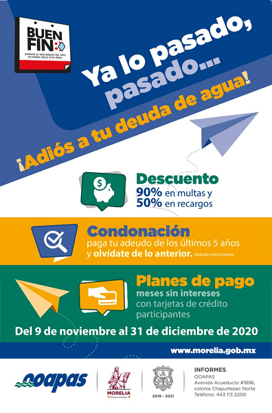 El OOAPAS mantendrá durante todo el mes de diciembre la promoción “Ya lo pasado, pasado… ¡Adiós a tu deuda del agua!” para que los usuarios con más de 5 años de adeudo se pongan al corriente y aprovechen la promoción de Pago Anticipado vigente.