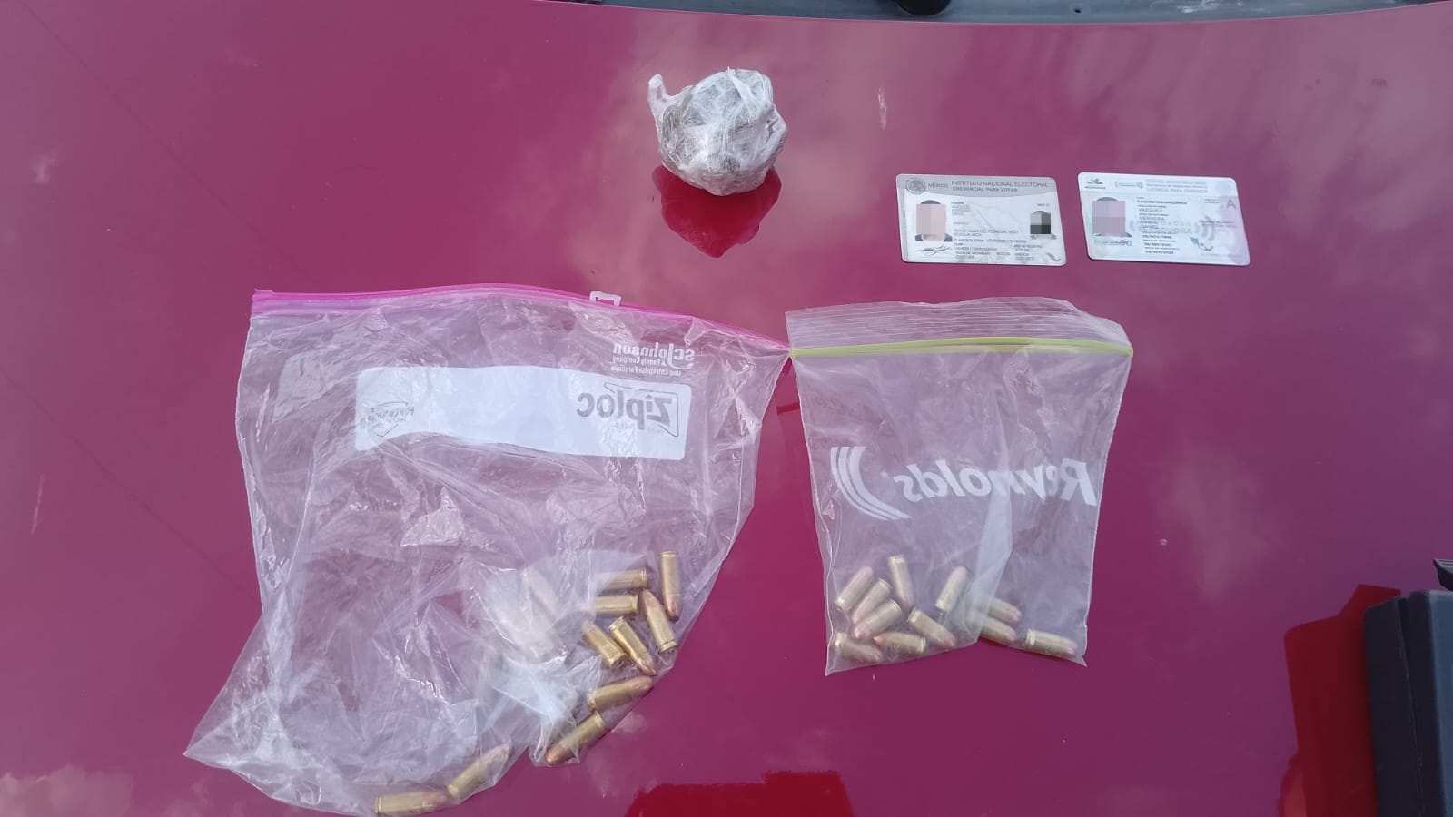 En total fueron detenidas 2 personas y asegurados cartuchos calibre 9 mm y 0.380, un vehículo y hierba con las características de la marihuana.