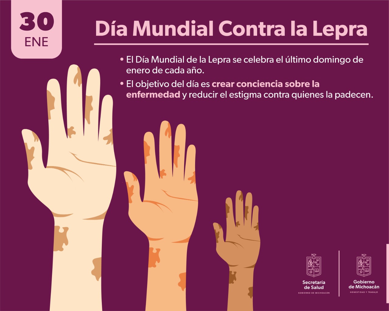 Morelia, Michoacán, a 30 de enero de 2022.- En el marco del Día Internacional de la Lucha contra la Lepra, que se conmemora el último domingo de enero y bajo el lema “Crear conciencia y destruir el estigma”, la Secretaría de Salud de Michoacán (SSM) exhorta a la población a detectar a tiempo y a no abandonar el tratamiento gratuito, en caso de presentar síntomas de esta enfermedad.