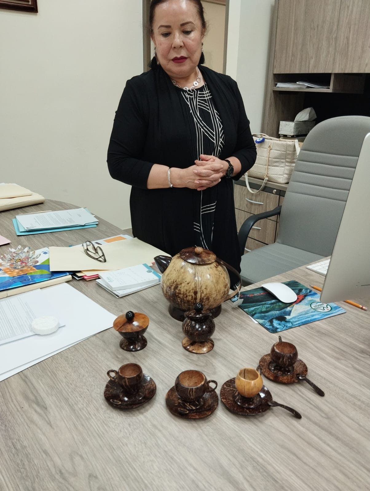 Cd. Lázaro Cárdenas, Michoacàn a 09 de Octubre del 2023.-Atendiendo la invitación que hizo la Dra. Yarabi Ávila González, Rectora de la Universidad Michoacana de San Nicolás de Hidalgo (UMSNH) a la Presidenta Municipal Itzé Camacho Zapiain, para donar una pieza artesanal representativa de nuestro municipio; este lunes a través del Departamento de Turismo se hizo entrega de un juego de té conformado por 16 piezas realizadas con fibra de coco.