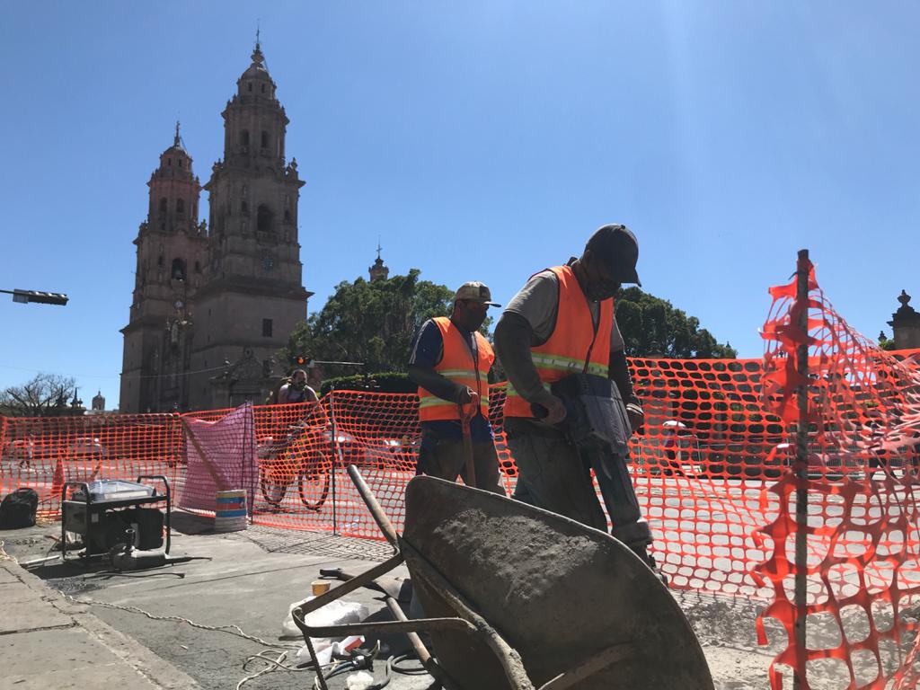 Morelia, Michoacán; a 18 de febrero 2021.- El Gobierno de Morelia realiza la instalación de dos ciclopuertos en el centro histórico, el primero de ellos a la altura del portal Hidalgo sobre la Avenida Madero.