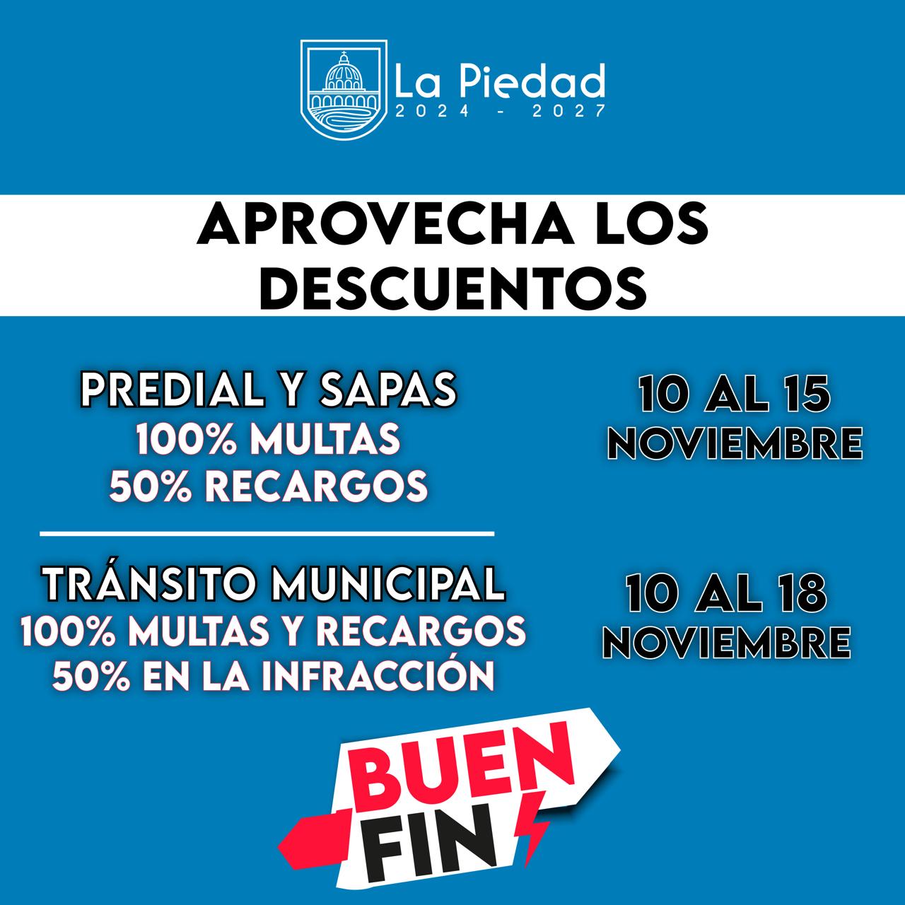 La Piedad, Michoacàn a 07 de Noviembre del 2015.- Con el objetivo de apoyar la economía de las familias piedadenses, el Gobierno Municipal de La Piedad invita a la ciudadanía a aprovechar los descuentos que se ofrecerán durante el periodo del “Buen Fin”, en distintos servicios municipales.