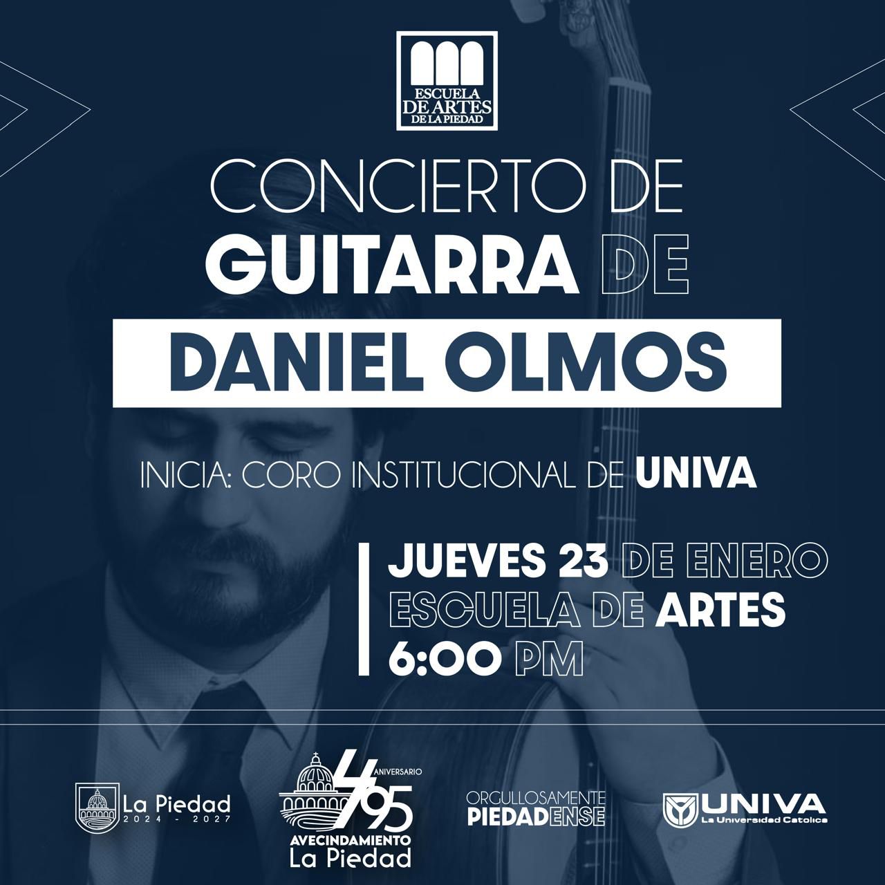 La Piedad, Michoacán, 22 de enero de 2025-Continuando con la celebración del 495 Aniversario del Avecindamiento de La Piedad, el destacado concertista “Daniel Olmos”, ofrecerá un concierto de guitarra este jueves a las 6:00 de la tarde en la “Escuela de Artes”, donde a través del Gobierno Municipal y en colaboración con UNIVA, invitan a los ciudadanos a ser partícipes de este evento gratuito.