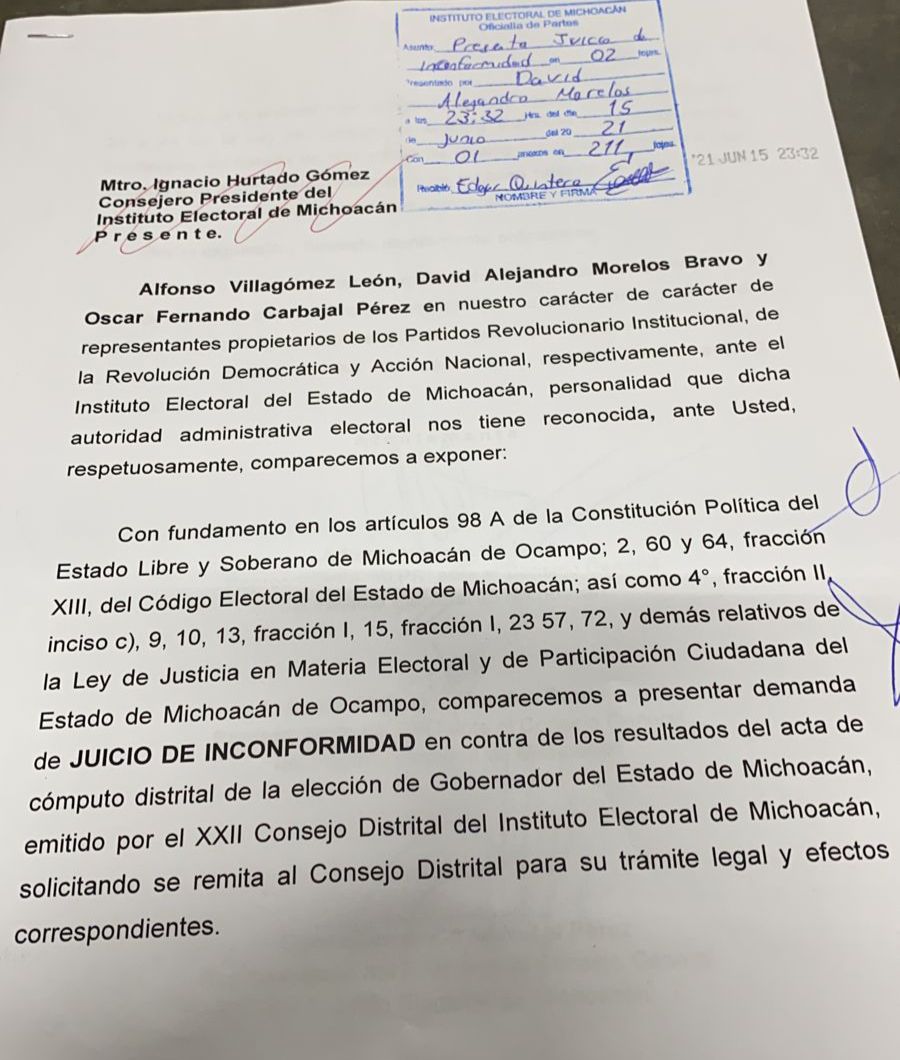 Lenin Sánchez, también Secretario de Asuntos Electorales y Política de Alianzas del PRD, abundó que el recurso se presentó en tiempo y forma ante el Consejo General del Instituto Electoral de Michoacán (IEM), y no ante el Consejo Distrital de Múgica por las amenazas que hubo al Equipo por Michoacán, por ello tal y como corresponde a la estrategia del Equipo por Michoacán, se recurrirá a la impugnación ante el Tribunal Electoral del Poder Judicial de la Federación.