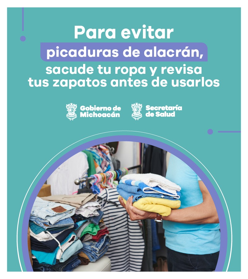 Debido a que los alacranes se esconden fácilmente en montones de piedras, leña, escombros en general y en épocas de lluvia se acercan a las casas en busca de refugio, sacudir la ropa y zapatos antes de ponérselos, eliminar escombro de la vivienda y sus alrededores y eliminar exceso de maleza son acciones básicas que debe realizar la población en sus hogares