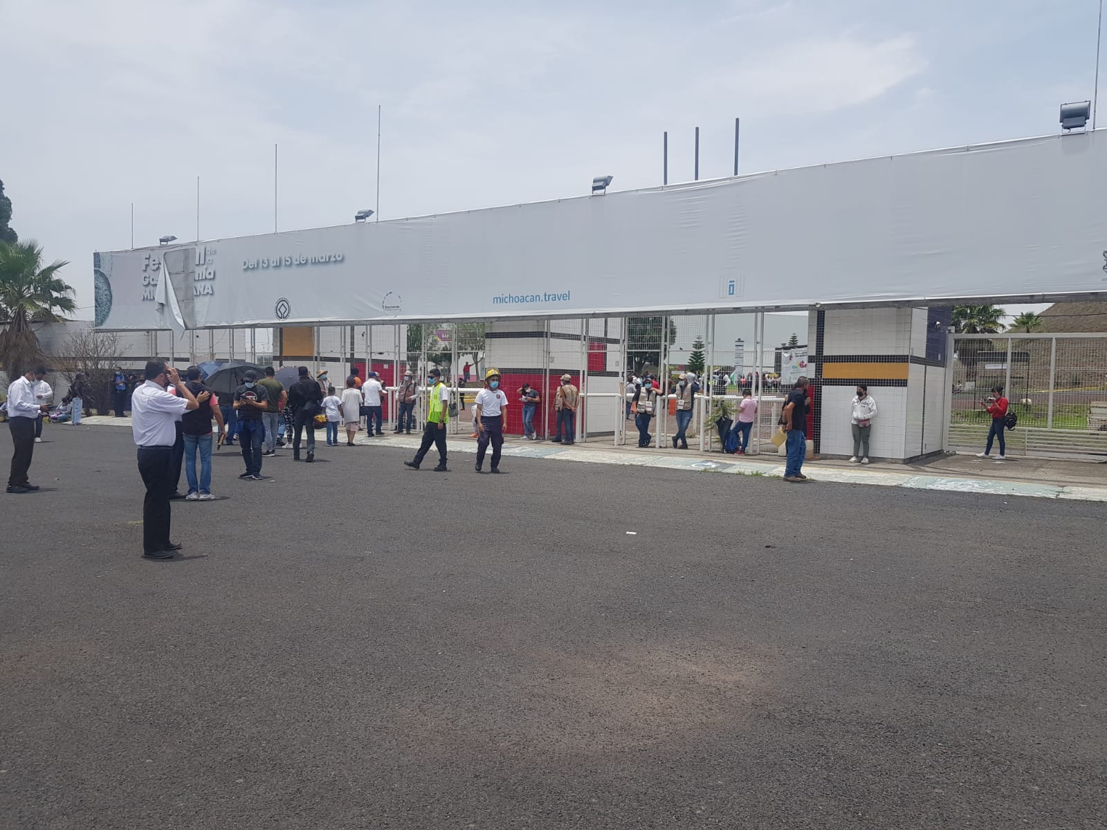 Personal de enfermería, médico, paramédico de la Secretaría de Salud de Michoacán (SSM), se mantiene en el macro módulo para atender a las y los ciudadanos de 40 a 49 años, en donde no se reportan filas para acceder al recinto en este momento.