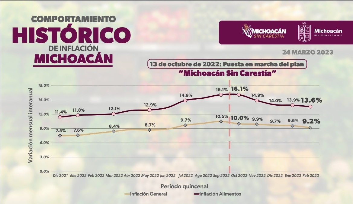En rueda de prensa encabezada por el gobernador Alfredo Ramírez Bedolla, el titular de la dependencia estatal apuntó que el referido índice pasó de 16.1 por ciento en octubre de 2022 a 13.6 por ciento a la fecha. Respecto al índice inflacionario general, que en octubre de 2022 estaba en 10 por ciento, a la fecha se ubica en 9.2 por ciento; el funcionario consideró que esos datos muestran que el monitoreo ha cumplido con su objetivo. Al exponer el comportamiento de precios en los seis municipios en los que se realiza el monitoreo, el funcionario destacó que, por primera vez, Zitácuaro se ubicó con el precio más bajo en la canasta básica, a través de la tienda Aurrerá, en la revisión realizada el 24 de marzo. Por lo que toca a Morelia, en la tienda Soriana reportó el mejor costo, con 987 pesos, 237 pesos por debajo de La Blanquita, que fue la que presentó el importe más alto; por lo que toca a Uruapan, el mejor precio lo ofreció Aurrerá, con mil 18 pesos 20 centavos, 47 pesos por abajo del mercado municipal; mientras que en Lázaro Cárdenas Aurrerá reportó el mejor monto con mil 29 pesos 70 centavos. En Apatzingán, el mercado municipal arrojó el mejor precio con mil 65 pesos 50 centavos, 63 pesos por debajo de Aurrerá; en tanto que, en Zamora, el costo más bajo lo tuvo Aurrerá con mil 017 pesos 70 centavos, 130 pesos debajo del mercado municipal. El comparativo de precios puede ser consultado en las redes sociales del Gobierno de Michoacán, del mandatario Alfredo Ramírez Bedolla, y de la Secretaría de Desarrollo Económico, así como en el portal de esta dependencia: https://sedeco.michoacan.gob.mx/michoacan-sin-carestia/.