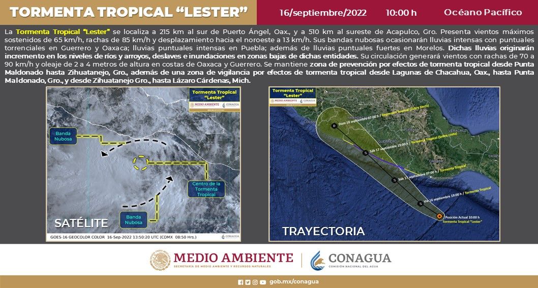 Morelia, Michoacán a 16 de Septiembre de 2022.- La Secretaría de Gobierno, a través de la Coordinación Estatal de Protección Civil invita a la población a tomar medidas de previsión ante la llegada de la Tormenta Tropical “Lester”.