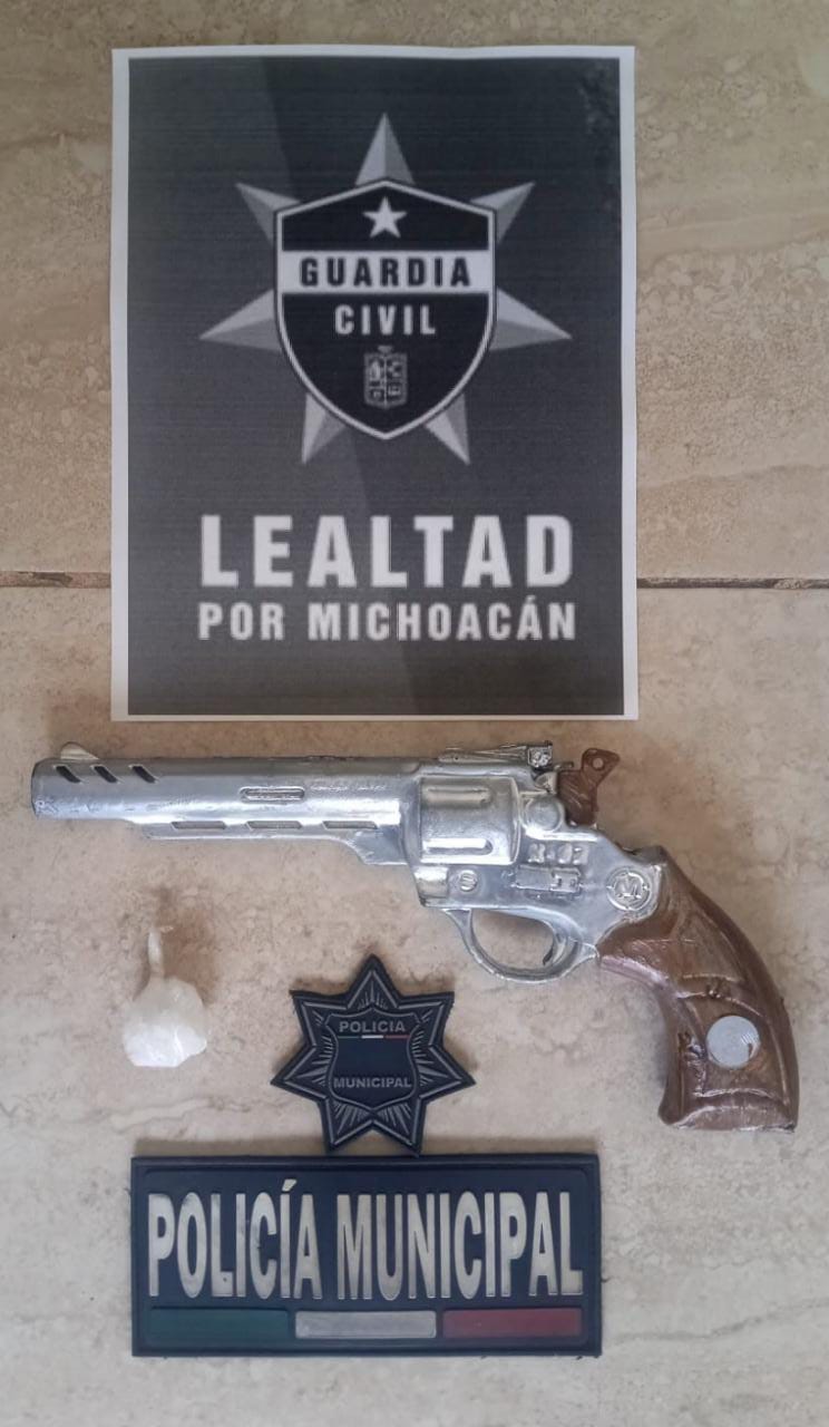 Zamora, Michoacán, 1 de agosto del 2022.- A efecto de continuar las labores operativas para inhibir el delito dentro del Blindaje Zamora, los agentes de la Secretaría de Seguridad Pública (SSP) y Policía Municipal, detuvieron a una persona del sexo masculino en posesión de droga y una réplica de arma de fuego.