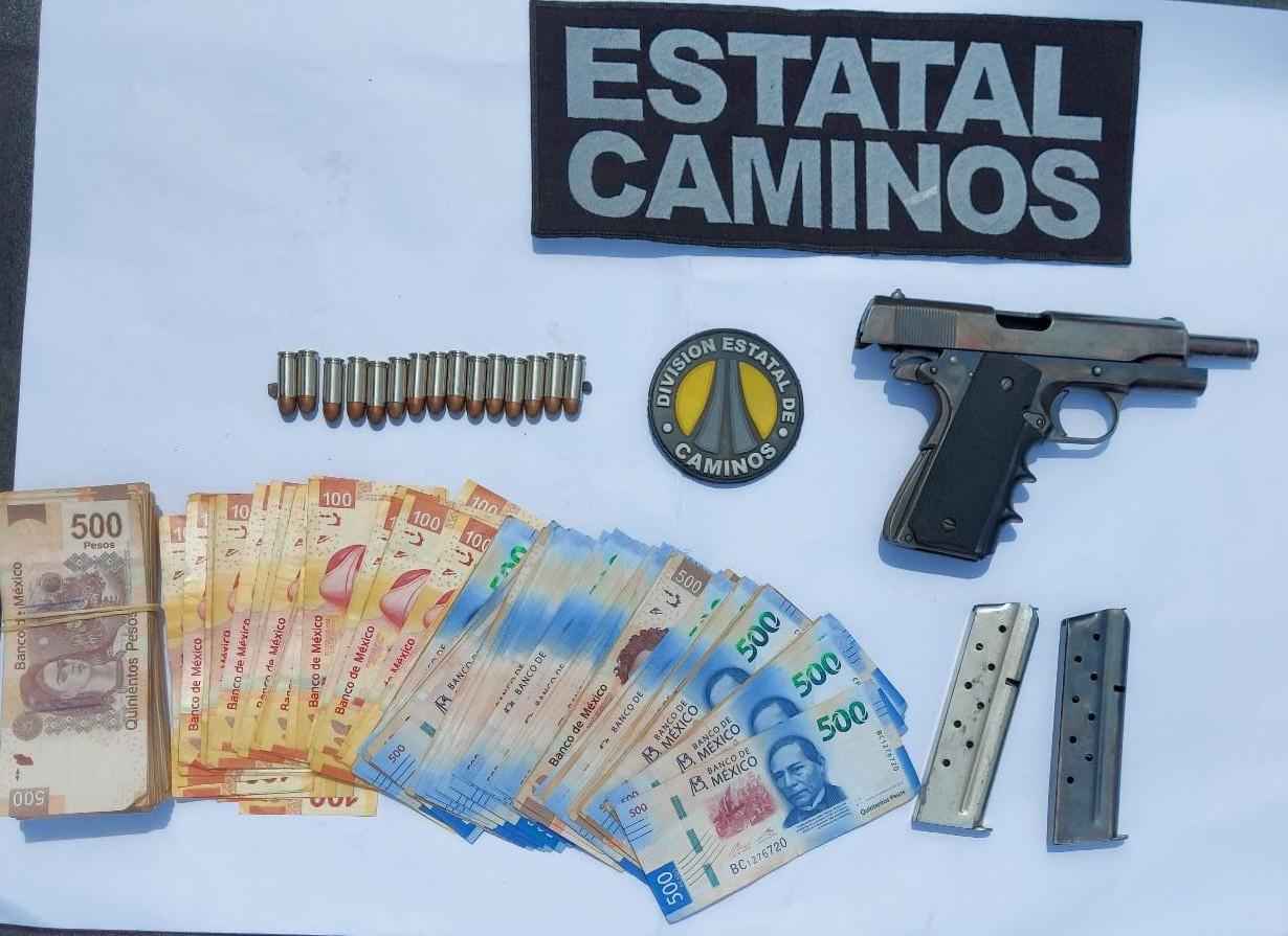 Durante las tareas de revisión, los oficiales localizaron al interior de la unidad un arma de fuego calibre .38 mm., dos cargadores, 15 cartuchos útiles, y dinero en efectivo, del cual, no se pudo justificar su origen.