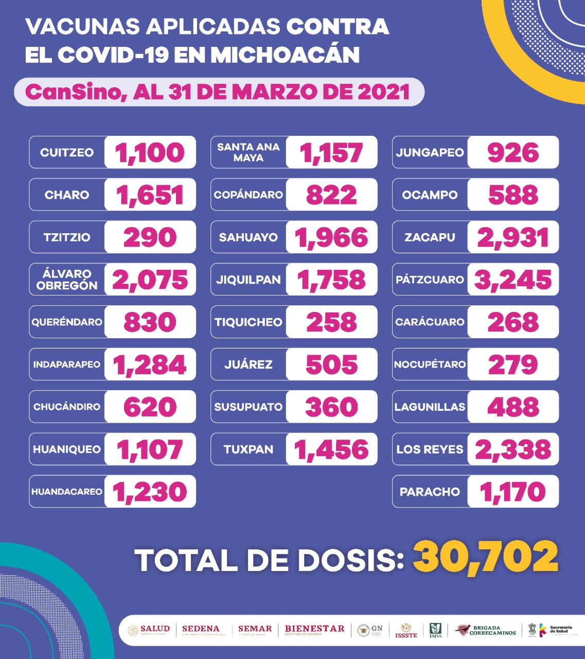 Actualmente 33 de los 64 municipios que están siendo beneficiados mantienen activa la vacunación y Morelia reiniciará este proceso a partir del 5 de abril, debido a que se está en la espera de más biológico para concluir con la vacunación del total de población adulta mayor.