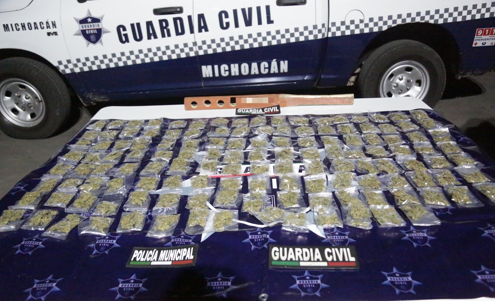Resultado de lo anterior, es que elementos de la Guardia Civil realizaron el aseguramiento de tres hombres, quienes recorrían la avenida Juárez a la altura de la colonia Lázaro Cárdenas y que les fueron localizadas 133 bolsas plásticas transparentes del citado enervante y una tabla, por lo que fueron presentados ante la autoridad correspondiente para llevar a cabo las diligencias pertinentes.