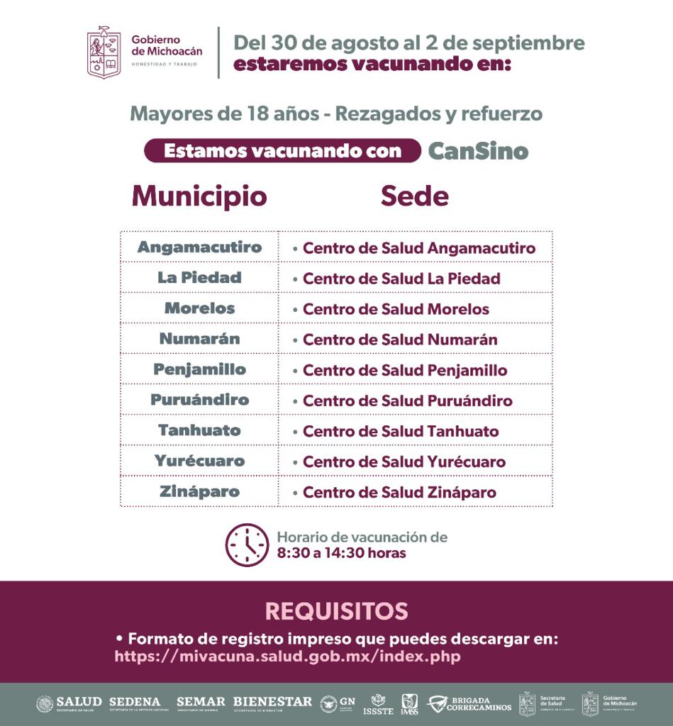 Morelia, Michoacán, 31 de agosto del 2022.- El Gobierno del Estado, a través de la Secretaría de Salud de Michoacán (SSM), vacunará durante todo el mes de septiembre a los rezagados, mayores de 18 años, que aún no cuenten con ninguna dosis aplicada contra el Covid-19 o que requieran el refuerzo.