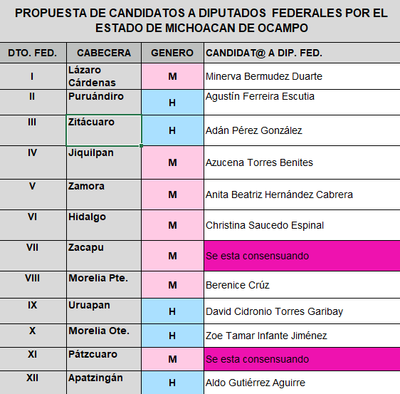 «ES»>En 10 de los 12 distritos electorales federales, quedaron registrados los siguientes aspirantes: Lázaro Cárdenas, Minerva Bermúdez Duarte; Puruándiro, Agustín Ferreira Escutia;  Zitácuaro, Adán Pérez González; Jiquilpan, Azucena Torres Benítez; Zamora, Anita Beatriz Hernández Cabrera e Hidalgo, Christina Saucedo Espinal.
