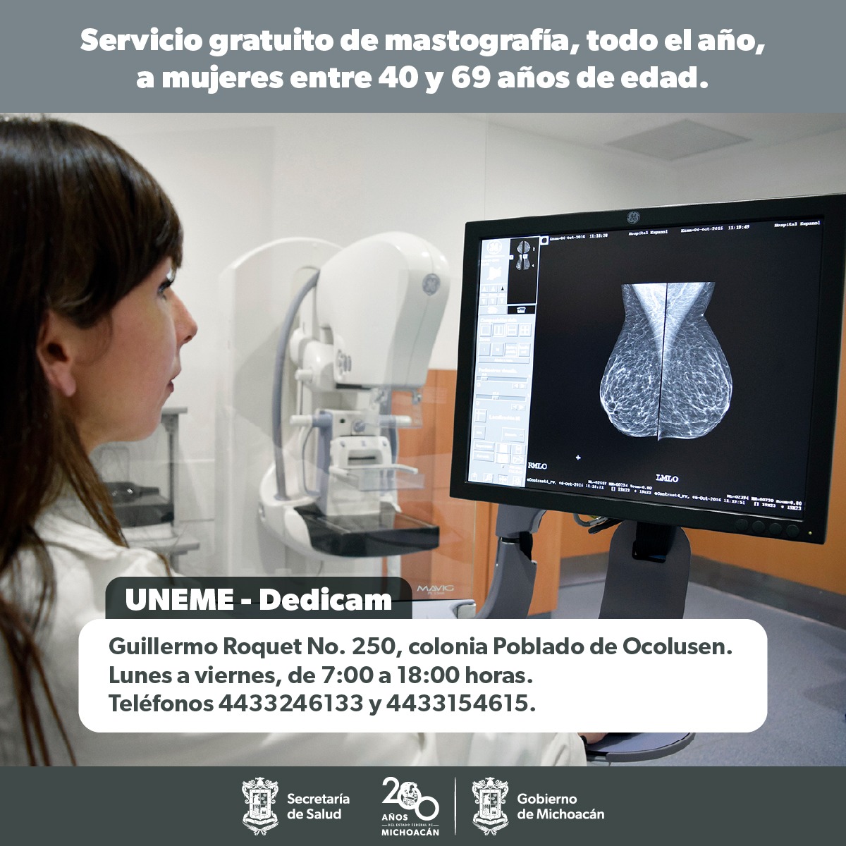 Morelia, Michoacán, 25 de marzo de 2024.- Durante las vacaciones de Semana Santa, la Unidad de Especialidades Médicas dedicada al Cáncer de Mama (Uneme Dedicam) de la Secretaría de Salud de Michoacán (SSM) permanecerá abierta en horario normal para brindar servicios gratuitos de mastografía, así como orientación sobre la prevención y tratamiento de esta enfermedad.