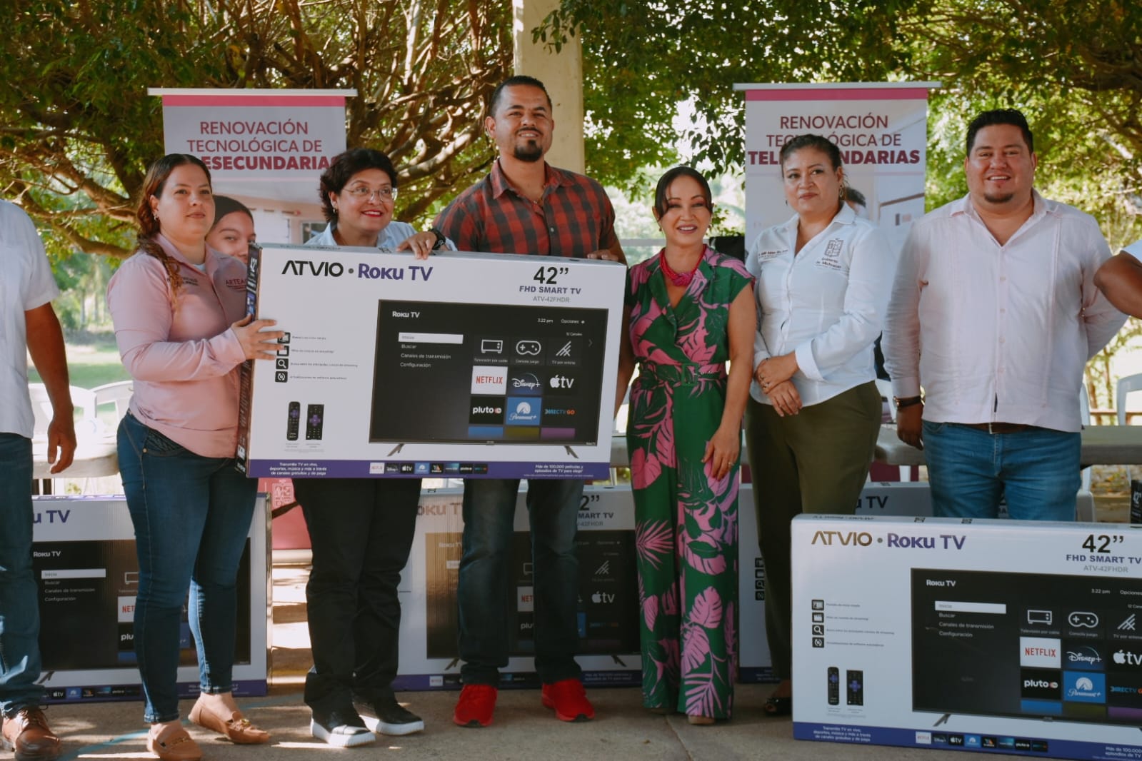 En su intervención, la Prof. Verónica Ortiz de la Cruz, Directora de la Telesecundaria Benito Juárez, informó que desde hace 42 años esta escuela, presta servicio en la tenencia, logrando cumplir el sueño educativo de cientos de estudiantes; por lo que agradeció a las autoridades el seguir apoyando con este equipo y tecnología, ya que apenas hace unos meses está escuela nuevamente recibió la señal y con la entrega de estos televisores, los alumnos podrán recibir una mejor educación.