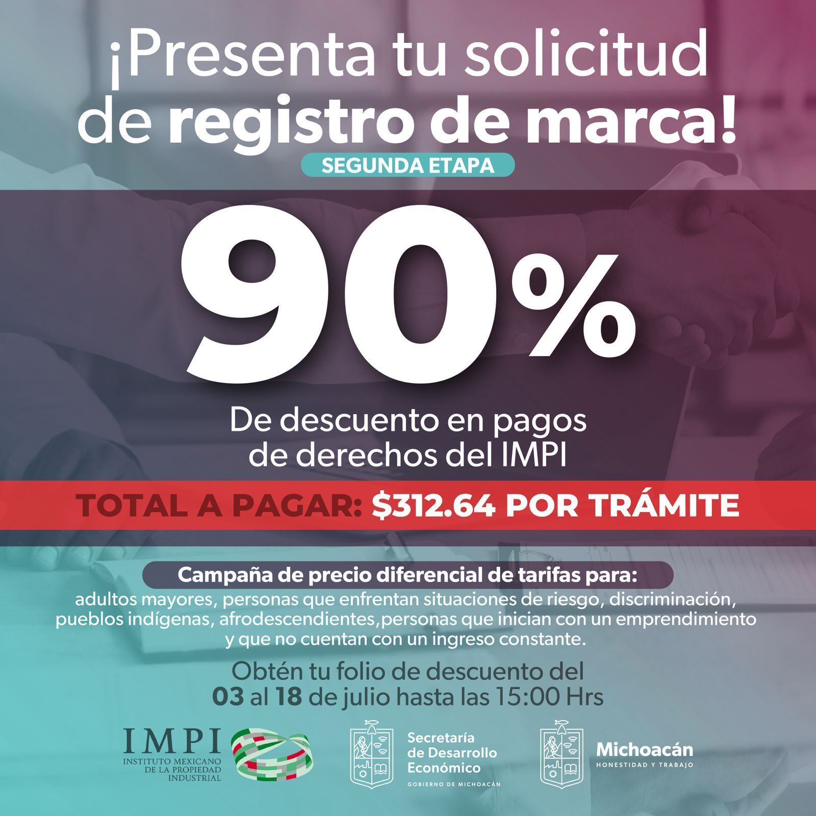 Morelia, Michoacán a 17 de julio de 2023.- De acuerdo con la Secretaría de Desarrollo Económico (Sedeco), este martes 18 de julio es el último día para acceder al beneficio del 90 por ciento de descuento sobre la solicitud de registro de marca ante el Instituto Mexicano de la Propiedad Industrial (IMPI).