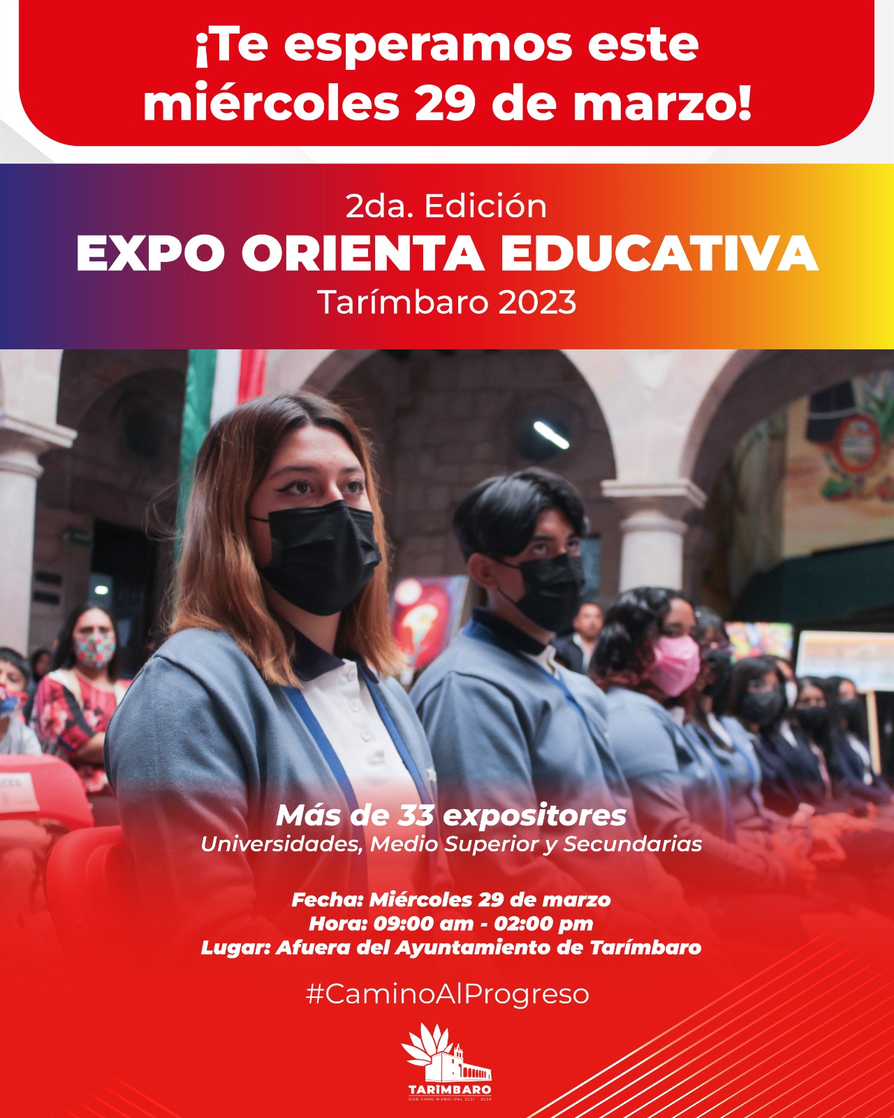 Tarímbaro, Michoacán, 27 de marzo de 2023.- El Gobierno de Tarímbaro, que encabeza el presidente Bladimir González, y la Dirección de Educación invitan a la 2da Expo Orienta Educativa Tarímbaro 2023, un evento que reunirá a más de 33 universidades, preparatorias, bachilleratos y secundarias del municipio.