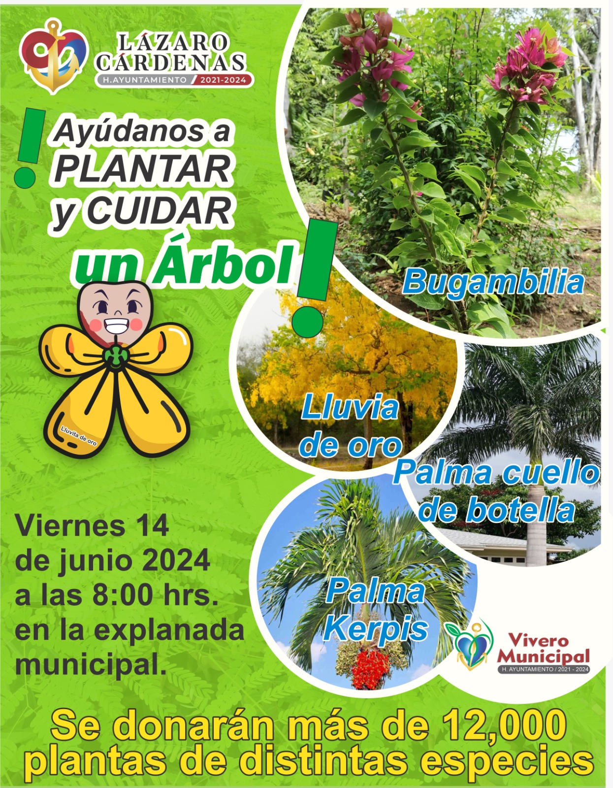 Cd. Lázaro Cárdenas, Michoacàn a 12 de Junio de 2024.- El Gobierno de Lázaro Cárdenas a través del Vivero Municipal invita a la población en general a la Campaña de Donación de Arbolitos que se realizará este viernes 14 de junio en la Explanada Municipal en punto de las 8:00 horas; en donde podrán adquirir de manera gratuita una de las ochos especies de árboles que se tienen.