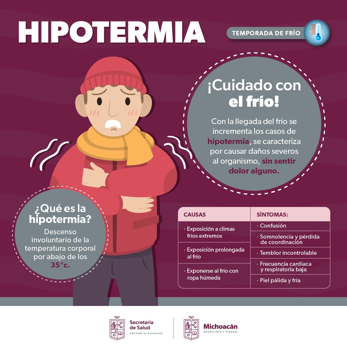 Ante signos de alerta como temblor incontrolable del cuerpo, somnolencia, mareo, dolor de cabeza, balbuceo (hablar arrastrando palabras), confusión y torpeza o falta de coordinación, se recomienda abrigarse inmediatamente, tomar líquidos calientes y acudir a la unidad de salud más cercana.