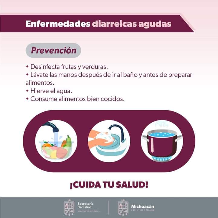 Los síntomas más comunes suelen ser, diarrea o dólares estomacales, vómito, náuseas, fiebre, evacuaciones liquidas (más de 3 al día). La diarrea puede conllevar a la deshidratación, y de no ser atendida a tiempo, puede causar otras complicaciones; por ello, la importancia de acudir a su unidad de salud más cercana.