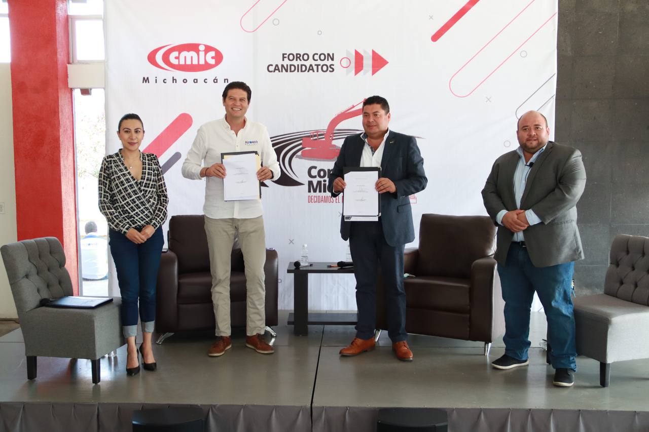 En el marco del foro convocado por la CMIC, el abanderado del PAN y el PRD destacó por su visión de desarrollo para Morelia al ofrecer comunicación directa, abierta y permanente para atender e incorporar a su plan de gobierno las 4 propuestas del sector: Ratificar el lugar que tiene la cámara en diferentes órganos de las distintas instancias de gobierno y de consulta; Transparentar la información sobre licitaciones; Establecer obligatoriedad de la capacitación empresarial; y Ratificar el convenio en materia de capacitación, obras de beneficio social y para elaboración de proyectos.
