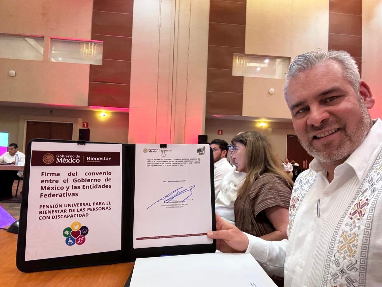 Acapulco, Guerrero, 10 de diciembre de 2024.- En sesión ordinaria de la Conferencia Nacional de Gobernadores (Conago), el mandatario Alfredo Ramírez Bedolla firmó el convenio para la Universalidad de la Pensión para el Bienestar de las Personas con Discapacidad, entre el Gobierno de México y las entidades federativas.