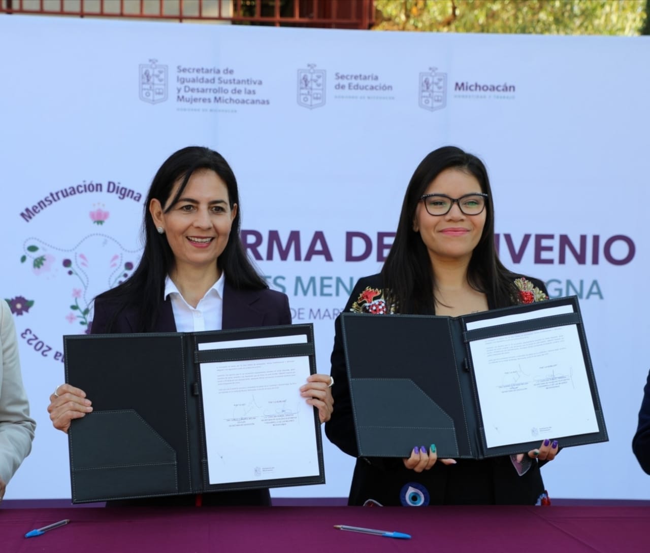 Morelia, Michoacán, 6 de marzo de 2023.- En el marco de las actividades por el Día de la Mujer, la secretaria de Educación, Gabriela Molina Aguilar, firmó un convenio con su homóloga de la Secretaría de Igualdad Sustantiva (Seimujer), Carolina Rangel Gracida, para implementar el programa de Menstruación Digna y redoblar esfuerzos en la eliminación de tabús, bullying y demás acciones que vulneren a las más de 636 mil alumnas de la entidad.