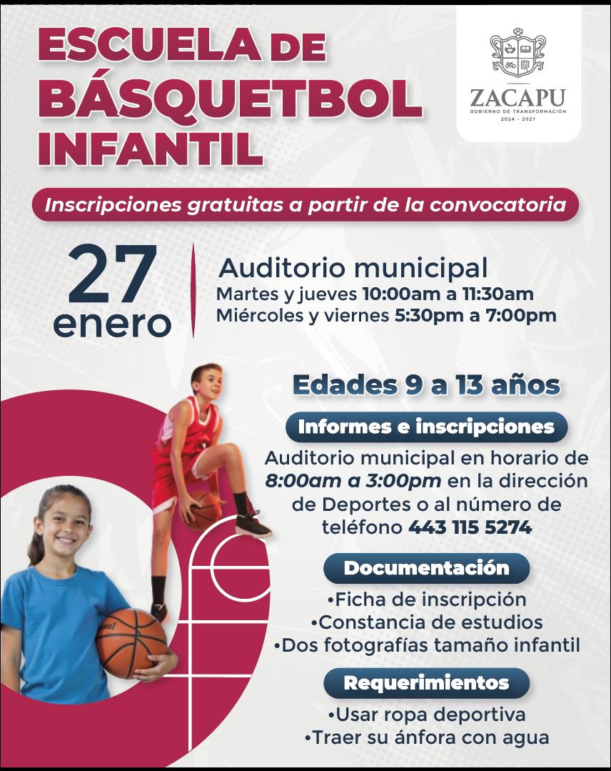 Zacapu, Michoacán, 20 de Enero de 2025.- Fomentar el deporte desde la infancia es fundamental para un desarrollo saludable, por ello, el Gobierno de Zacapu invita a niñas y niños de 9 a 13 años de edad a participar en la Escuela de Basquetbol Infantil.