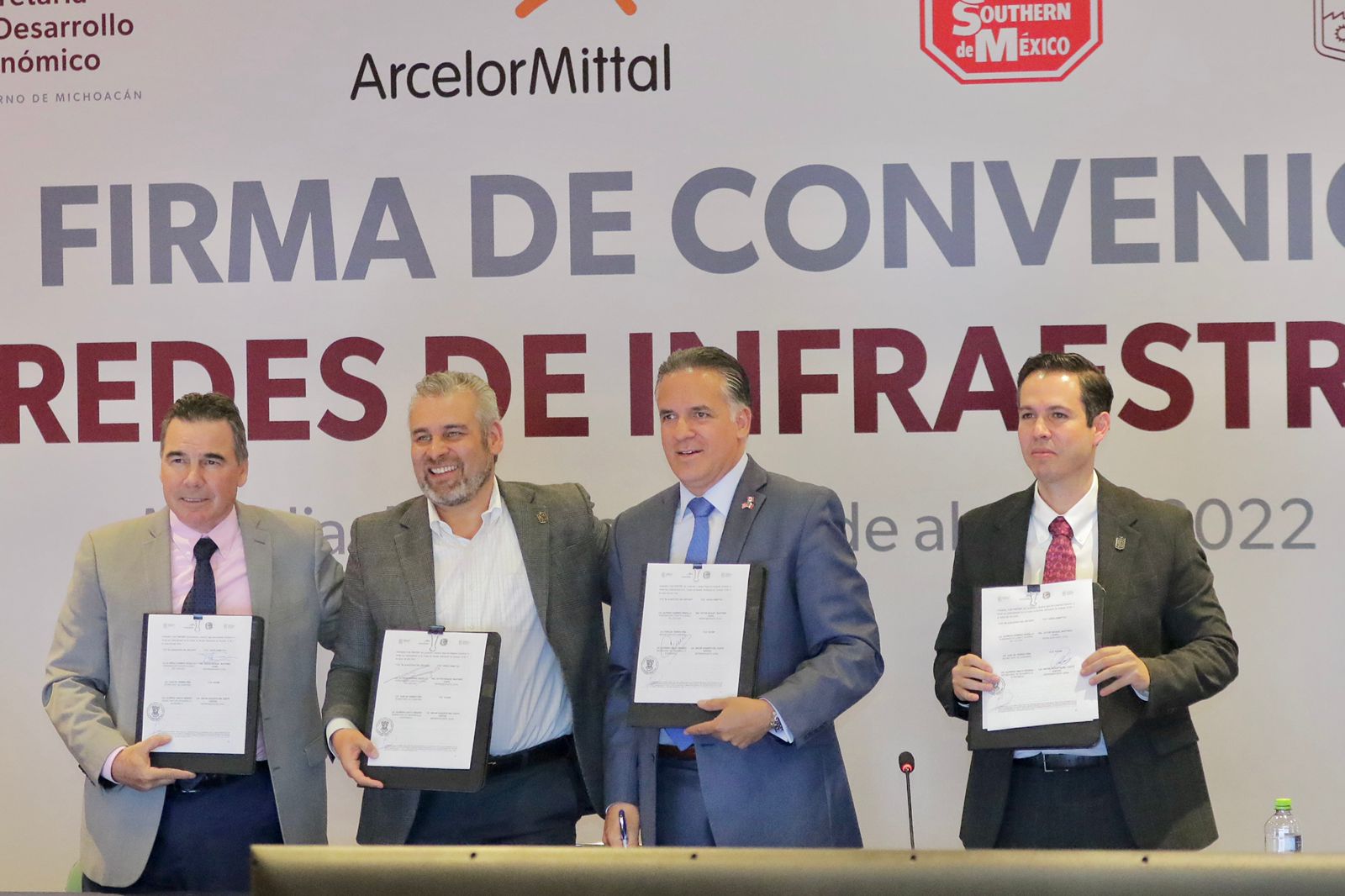 Morelia, Michoacán, 19 de abril del 2022.- En un trabajo de colaboración entre el sector privado y el Gobierno Estatal, el gobernador Alfredo Ramírez Bedolla, firmó un convenio con las empresas transnacionales Arcelor Mittal y Kansas City Southern (KCS) de México, con el cual ambos corporativos participarán en el fortalecimiento de las redes de infraestructura en Michoacán, aportando ecograva y trasladándola a 20 municipios.