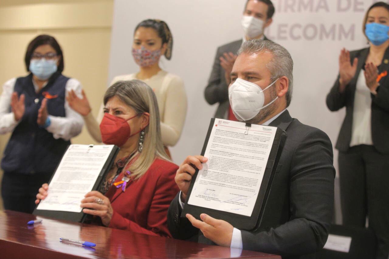 Morelia, Michoacán, 25 de noviembre del 2021.- Tras firmar un convenio con Telecomunicaciones de México (Telecomm), el gobernador Alfredo Ramírez Bedolla señaló que se aprovechará la infraestructura de este organismo descentralizado de la federación para hacer llegar a un mayor número de michoacanos los programas de apoyo social.